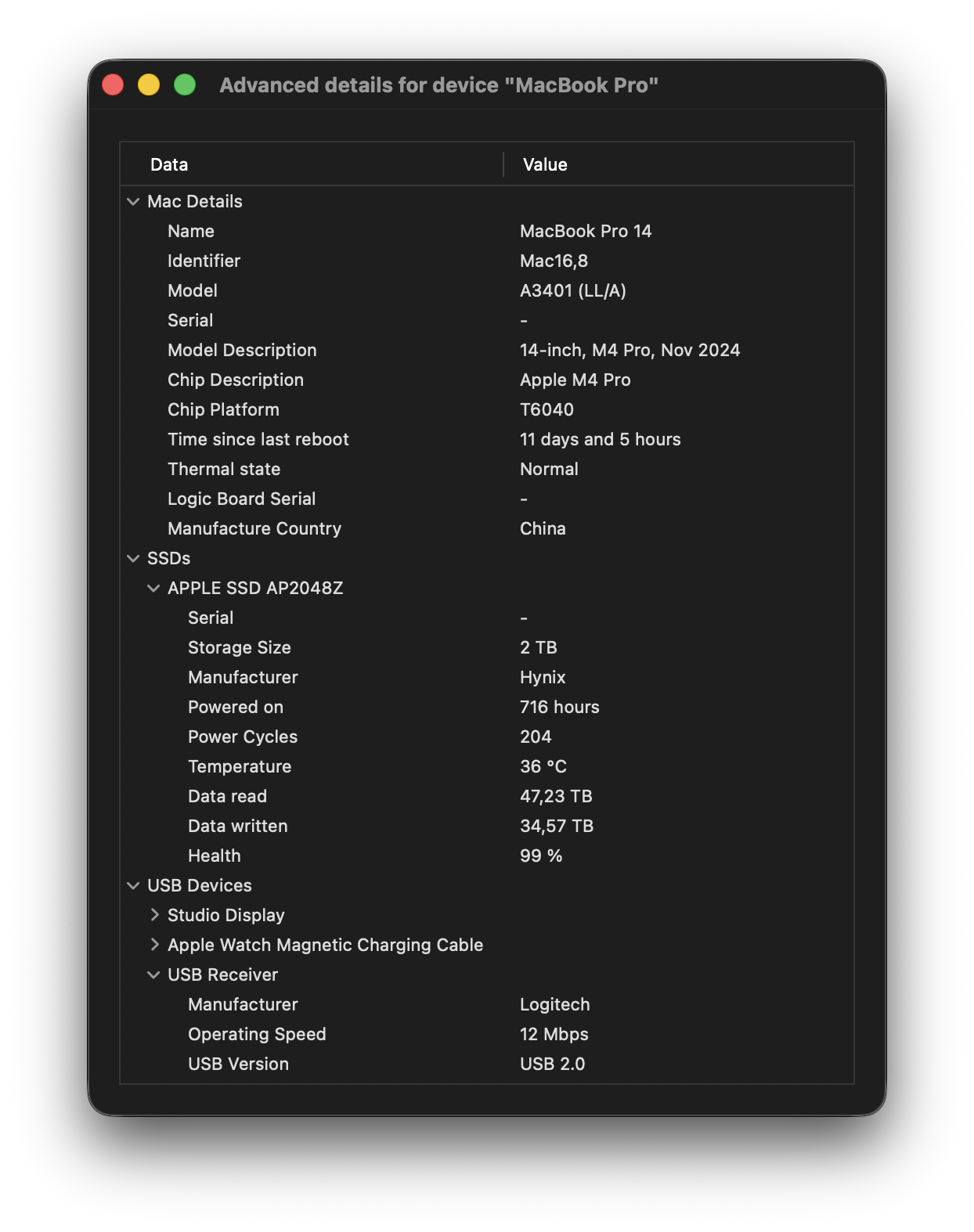 For Mac, it displays comprehensive information about your internal SSD, including data read and write statistics.