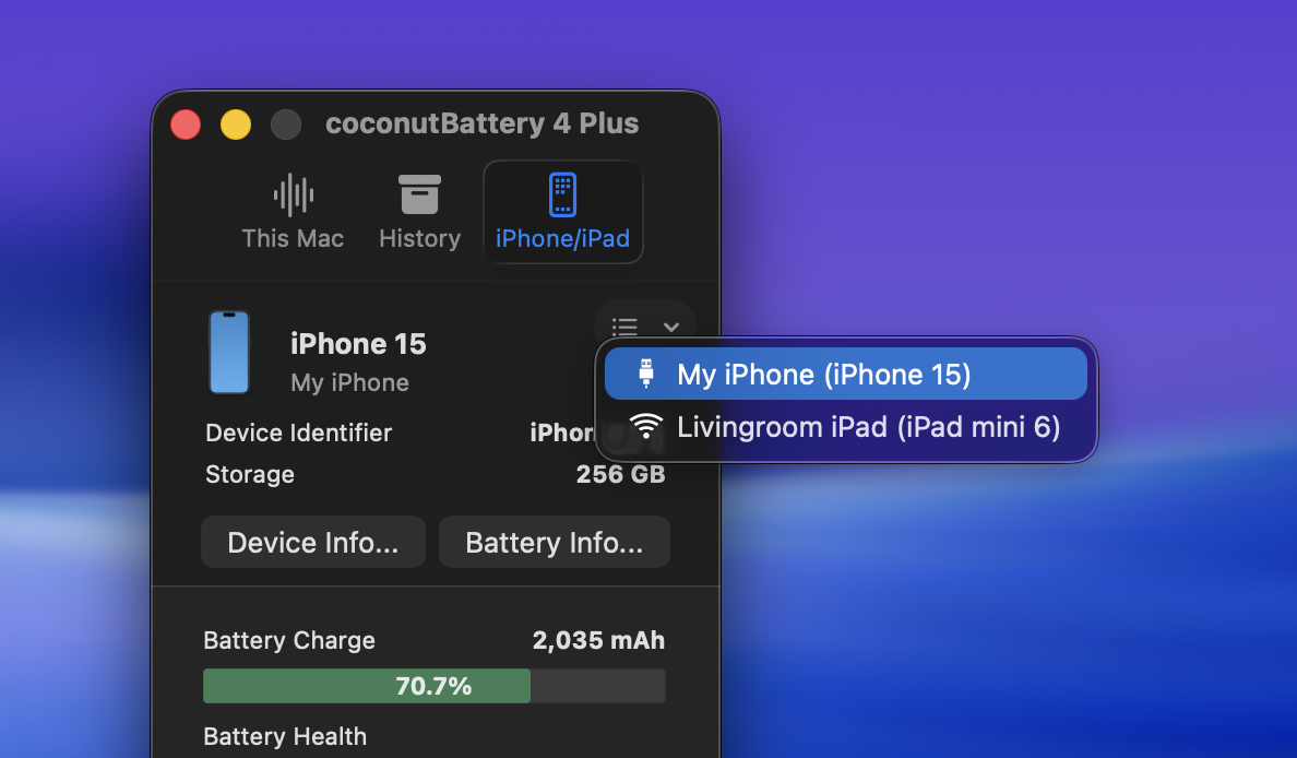 Once you’ve enabled Wi-Fi communication between your Mac and iPhone/iPad, you no longer need a USB connection to check your device’s health through coconutBattery.