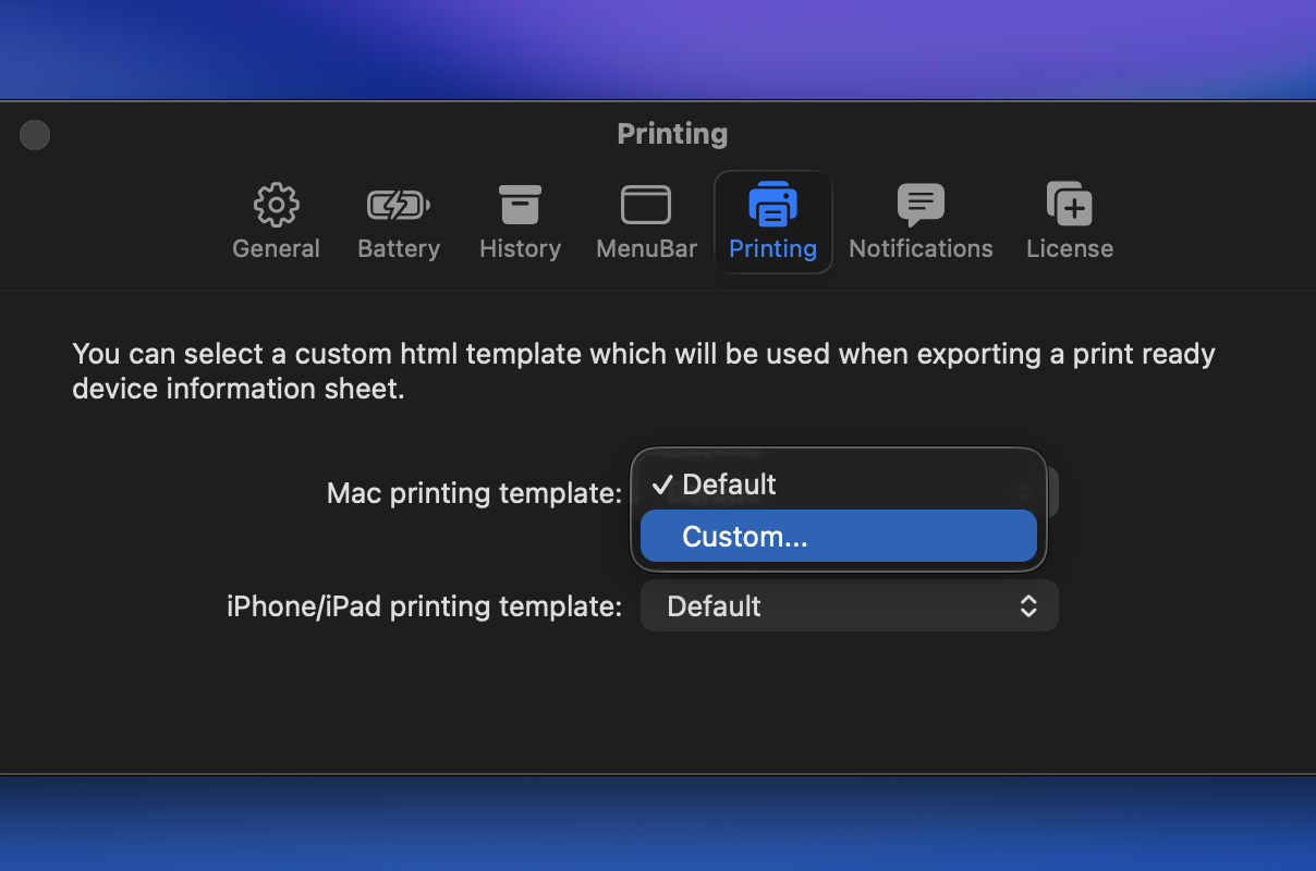 You can use your own customized HTML templates for printing Mac and iOS device reports.